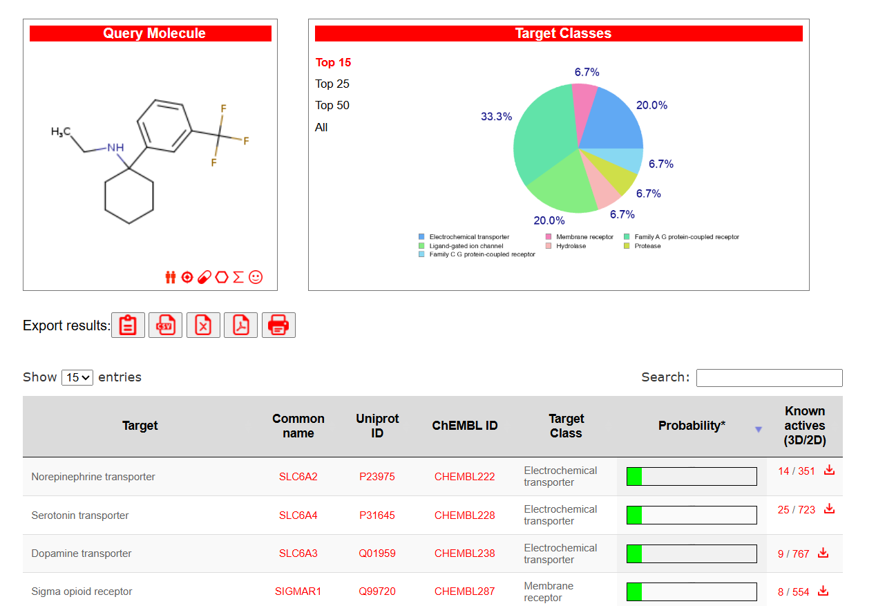 Oben links ist das Molekül und unten die Rezeptoren von oben nach unten gelistet, an welchen es die wahrscheinlich höchste Bindungsaffinitäten besitzt.