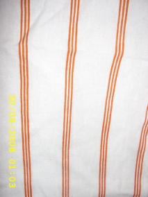 Stuhlhussen sind aus pflegeleichter Baumwolle (man kann sie bei 60 Grad waschen und sie strahlen wieder wie neu), in kräftigem Orange gestreift auf weißem Untergrund, sind selbstverständlich frisch gewaschen! Die vier zusammen gibts für 12 Euro.