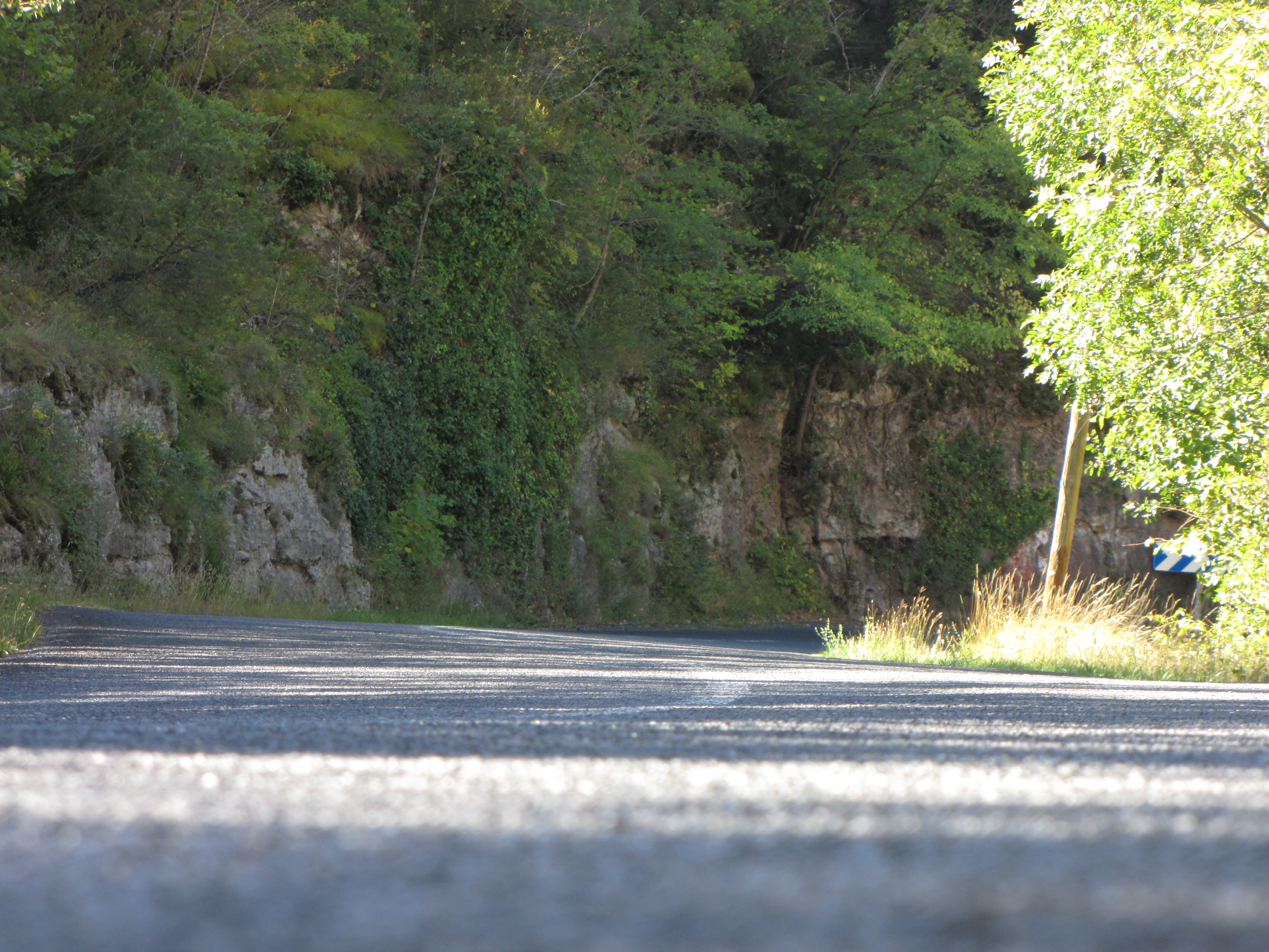 Blick auf den Straßenbelag der D991 an einer Biegung der Dourbie in der Nähe von La Roque-Ste-Marguerite