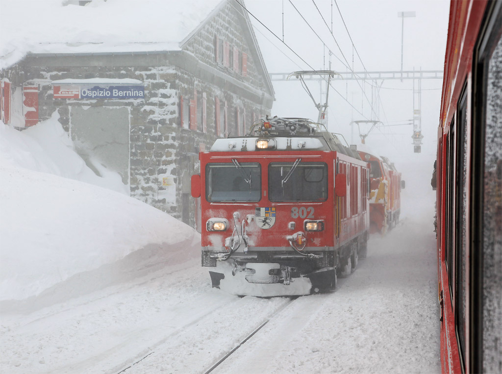 Gem 4/4 801, Rotary Xrotet9219 und Gem 4/4 802 in Ospizio Bernina