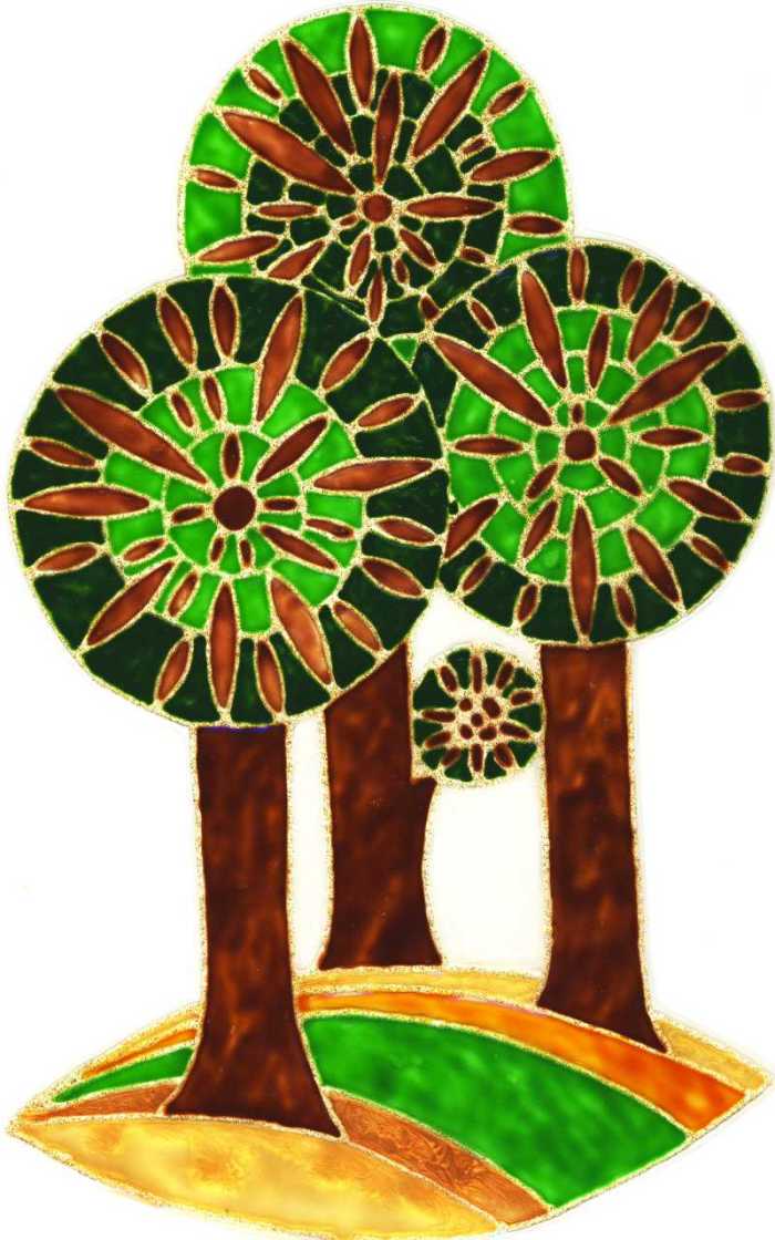 Baumlandschaft; Kontur in Glitzergold, ausgemalt mit Natur-/Erdfarben