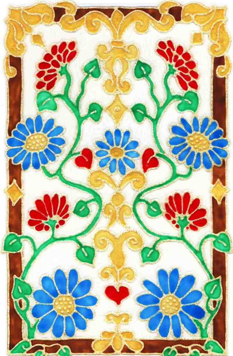 Blumenranken; Blumen in Glitzerblau, Rot und Gold; Hintergrund Glasklar, Umrandung Dunkelbraun;