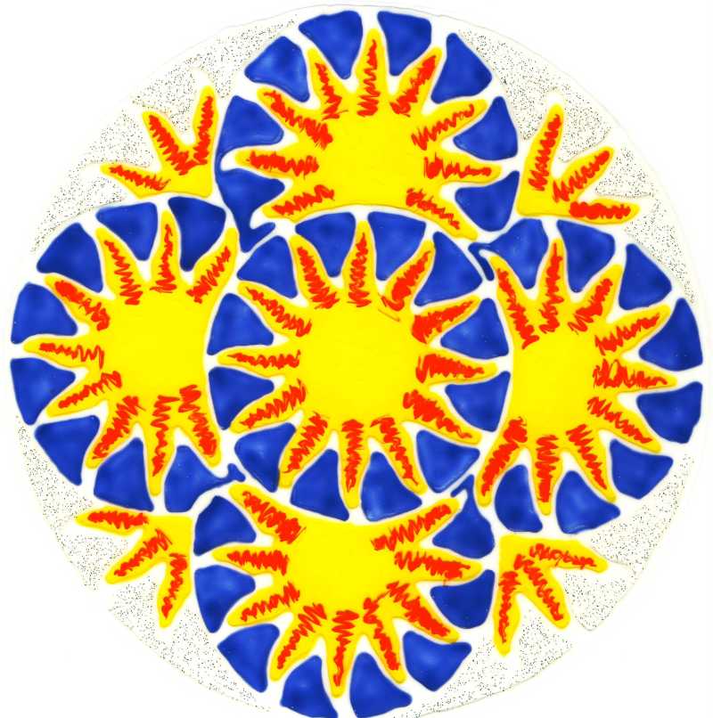 Summer Sun; Kontur in Weiß, Umrandung in dezentem Glitzer Silber, ausgemalt mit Rot, Gelb und Blau, mit Stäbchen verzogen;