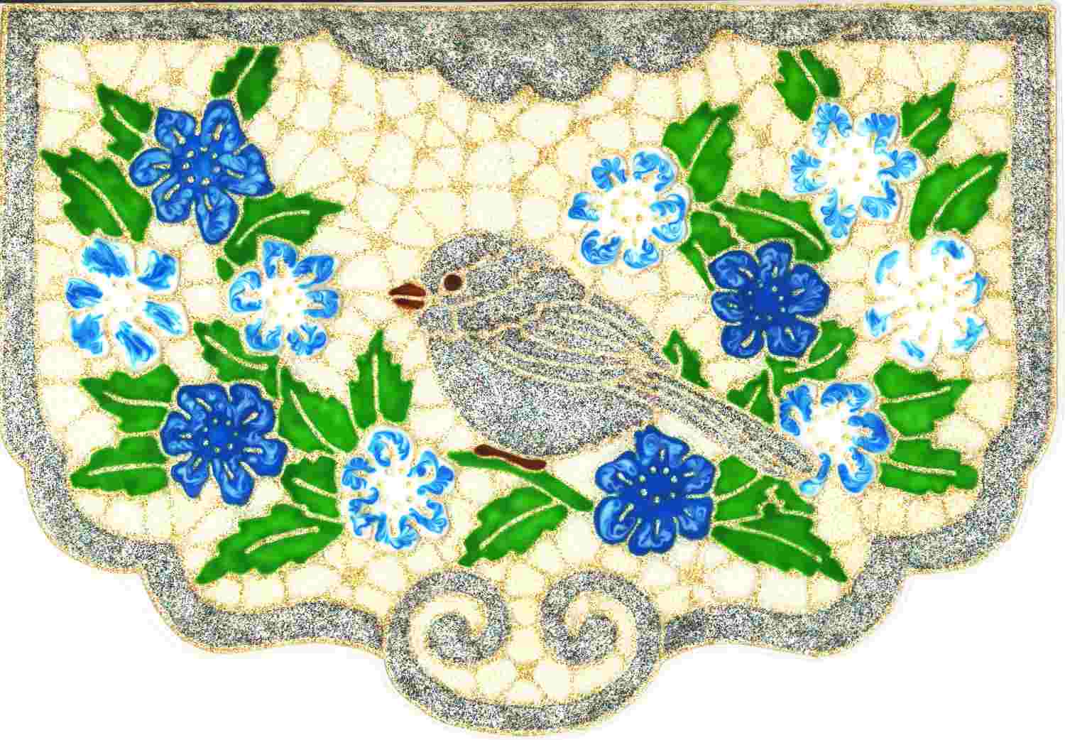 Vogel im Frühling; Kontur in Glitzergold, Vogel und Umrandung in Glitzerbunt, Blümchen in Blau und Weiß, Hintergrund dezentes Glitzergold